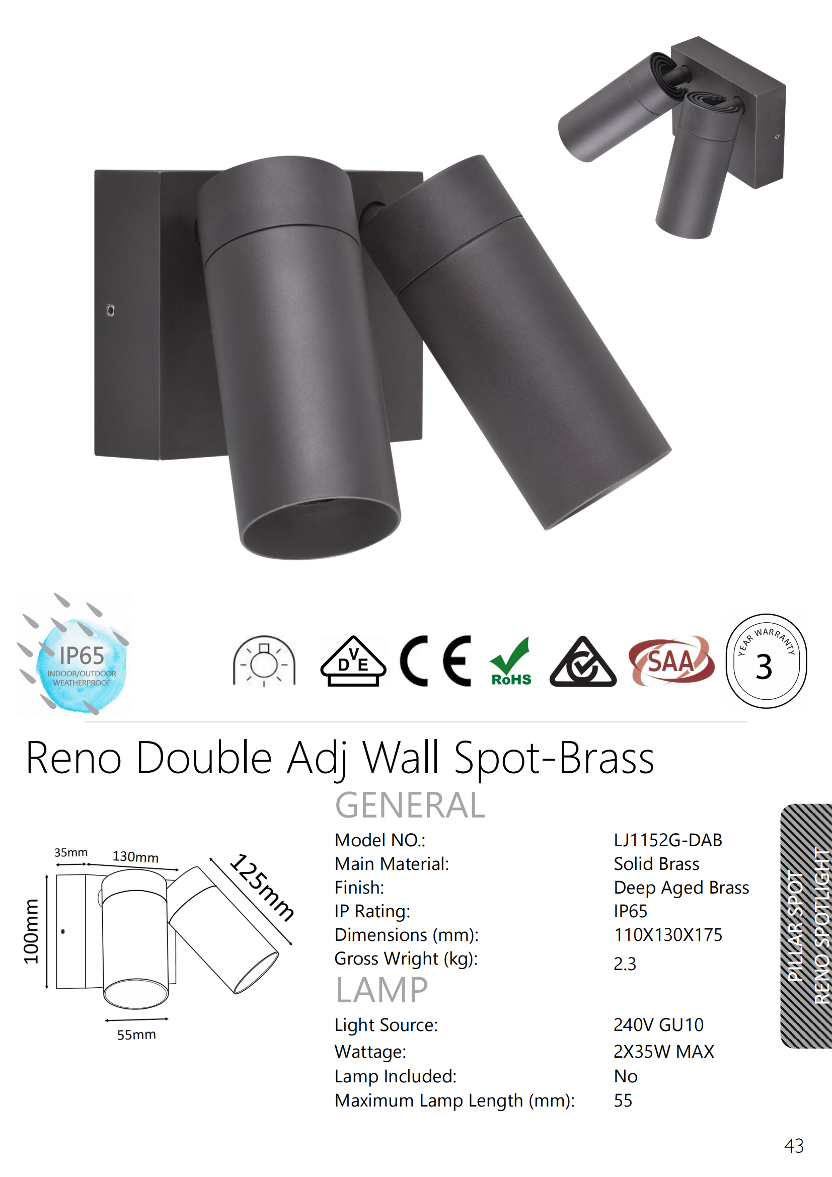 - Previous Product:Deep Aged Brass Reno Double Adjustable Spot Lights with sensor