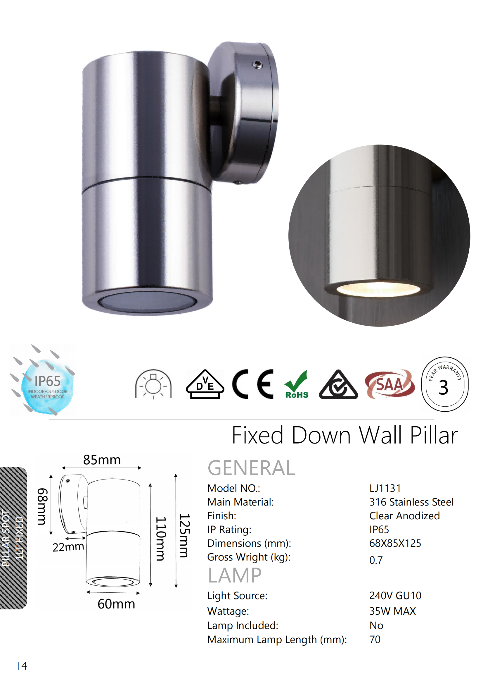 316 Stainless Steel Fixed Down Wall Pillar Lights